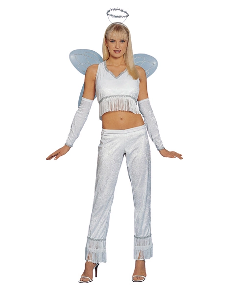 Heavenly and beautiful this angel is pure through and through. Costume features a velveteen fringed crop top, fringed trim pants and gloves.