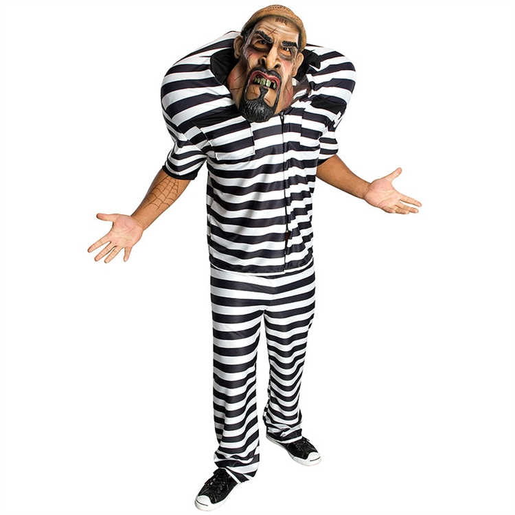He did the crime, but he doesn’t want to do the time! This escaped convict is on the loose and won’t let any one stand in his way. This Big Bruizer Jail Bird Adult Costume includes a black and white striped zip-up shirt, an oversized character mask, and inflatable shoulders to beef-up your chest and shoulders. The vinyl character mask features great texture and wrinkle detailing. The large nostril opening provide easy breathing and has large eye holes to provide an unobstructed view. This prisoner man adult costume is sure to he a hit at your next Halloween party.