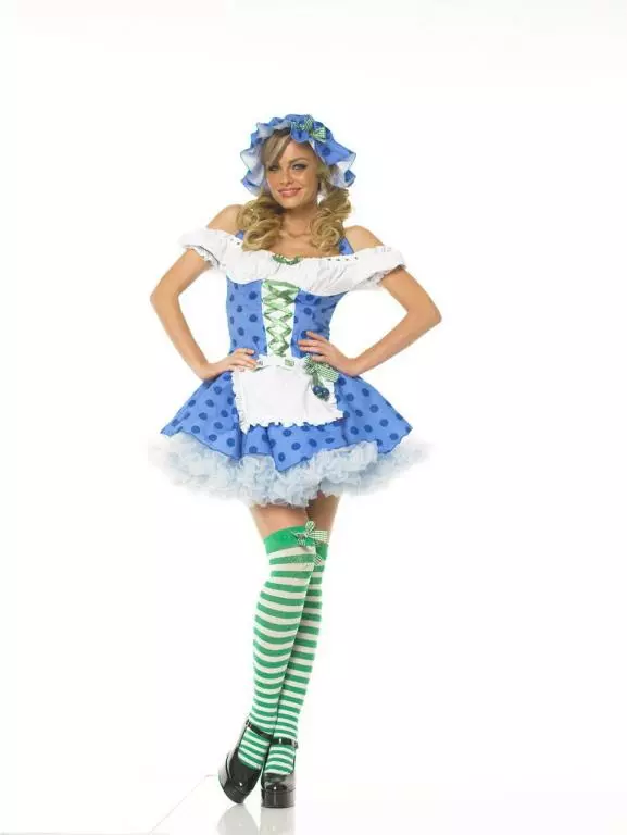 Sexy Blueberry!Costume includes: Blue and white peasantdress with charms, matching bonnet and striped stockings.