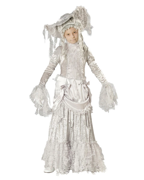 Everyone likes a ghost story and there are many that believe in ghosts. Around the world ghost hunters search large old manor houses and mansions, looking for a sign of a ghost living within. Trapped in time, these ghosts cannot escape from the walls in which they are confined. That is what the hunters will tell you and I suppose it makes sense. The Girl’s Deluxe Ghostly lady costume is an outfit that will make you resemble one of these beings from the past. The costume consists of a crush velvet gown of satin and lace. A petticoat from an era long ago. A torn and tattered lace hat fits with the white gloves and finally the victorian style grey wig, makes you a complete ghostly lady. This costume is ideal for an array of different functions, Halloween being the main one. Order it now and be a fightening being. * Features a dress with tattered and torn details, petticoat, hat with torn lace accents, matching gloves and grey Victorian era wig. * Shoes not included.