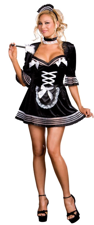Includes:Stretch velvet dress with adjustable lace trimmed straps, faux lace up with bow accents, pleated organza trim with ribbon detail on cups and hem, velvet shrug with 3/4 inch sleeves and matching pleated organza trim, headpiece, choker, satin apron, and feather duster.