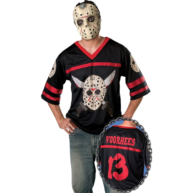 This Jason Friday the 13th Adult Costume includes a character-inspired hockey jersey and an EVA hockey mask. The jersey features several Jason mask logos and the number 13 and the name “Voorhees” on the back. Whether you are a hockey fan or looking to terrorize the campers and counselors at Camp Crystal Lake, this adult Jason costume is just what you have been looking for.
