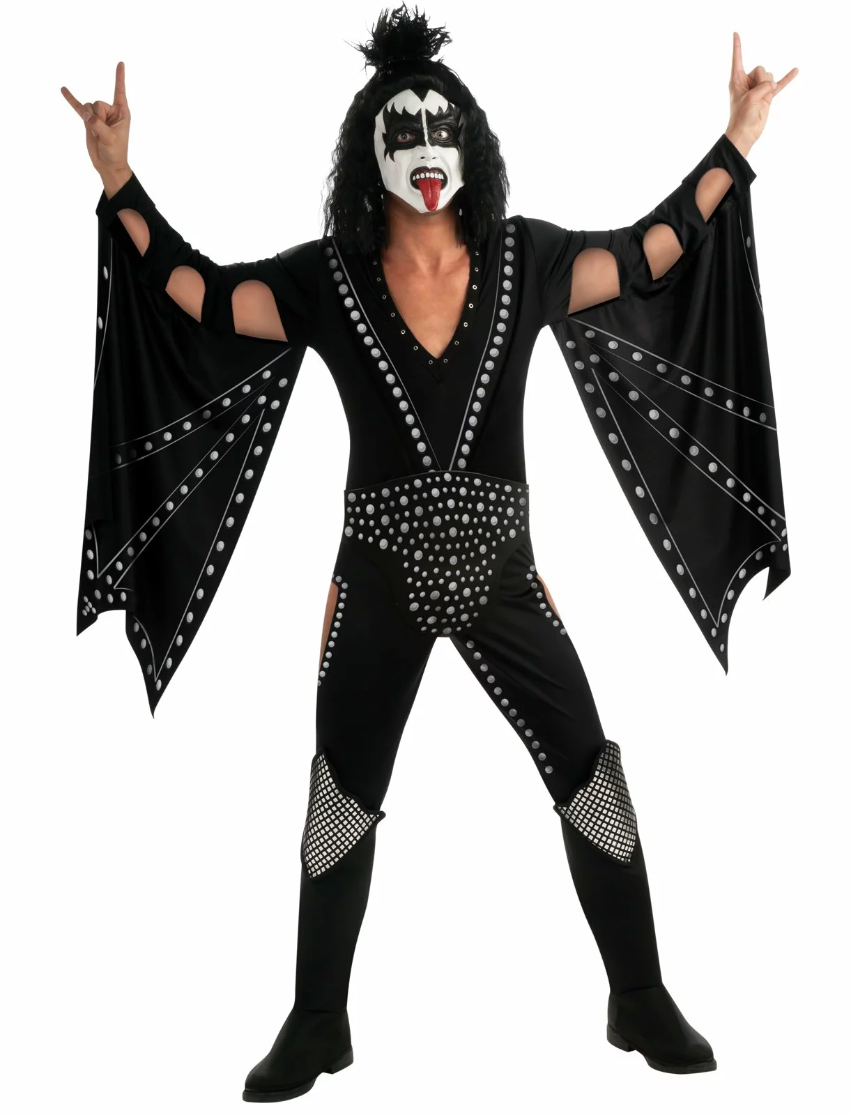 You’ll be spitting blood and breathing fire in the KISS – Demon Costume which includes: A black jumpsuit, choker, black Demon-style wig, boot covers and a cape designed to look like wings with attached fabric silver spikes. A belt featuring silver stud screen prints, gloves with fabric spikes and a pair of black/silver boot covers are also included in this eccentric entertainer’s ensemble.