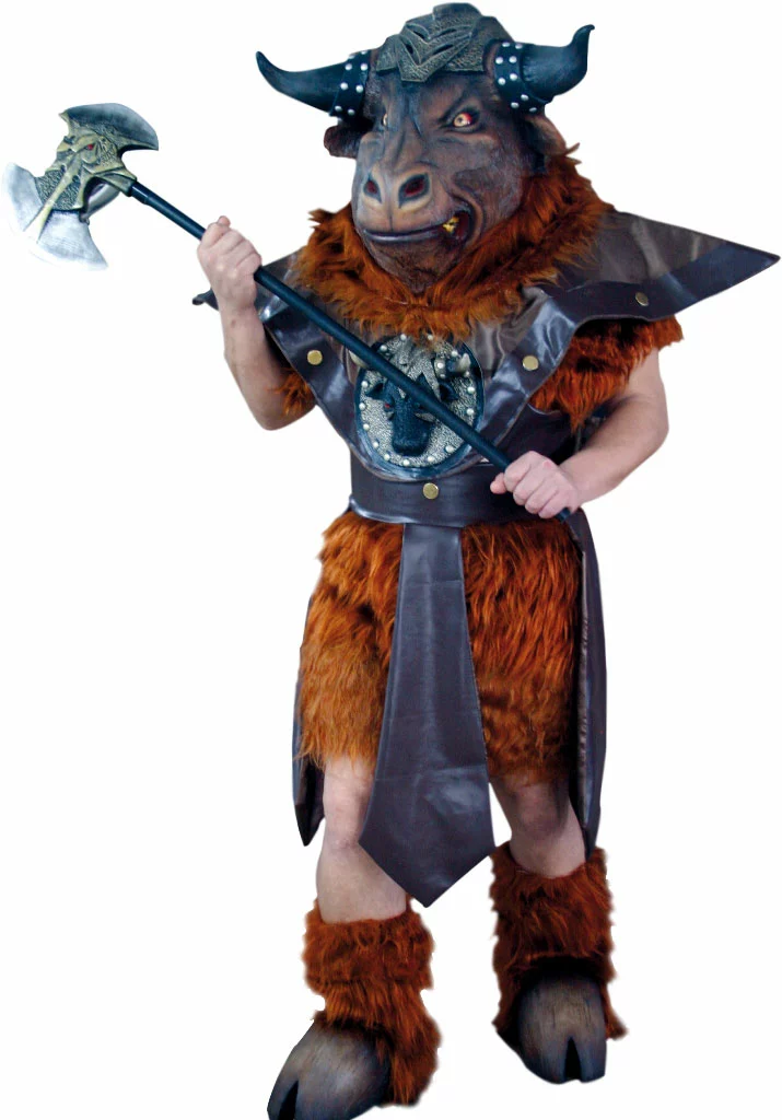 Our deluxe Minotaur Adult Costume will have you looking like a mythological creature from ancient Greek times. It will give you that half man and half bull look told about in mythology. Our 3-piece deluxe Minotaur Costume includes a faux fur and leather tunic, mask and shoe covers. You’ll be looking just like a Minotaur with the oversize bull head mask, attached brown faux fur chest piece with adjustable Velcro strap in back, cloven hoof shoe covers with attached brown faux fur legs, short faux fur tunic with faux leather trim and matching body armor. The Minotaur Mask is made of high quality latex and is comfortable to wear with the foam padding inside and eye slots in the center of the helmet piece for clear vision. The cloven hoof shoe covers have an elastic strap on the bottom to go under your shoe soles for a secure fit. The waist on the tunic is adjustable with Velcro and can fit up to a 42-inch waist. Our men’s deluxe Minotaur Costume would also be a great disguise for World of Warcraft fans that play a Tauren.