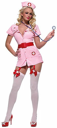 HeadpieceStethoscopeGartered DressBeltStockingsBrush up on your first aid skills because you will make them accident prone in this heart stopping feminine Naughty Nurse Costume. The pink smock dress fastens up the front with shiny metal pink buttons, it has two hip pockets with a red and white cross emblem patch on the front, and the red garter belt is sewn into the front and back bottom hem of the dress. The red vinyl belt, blue stethoscope, opaque pink tights decorated with red and white cross patches and shiny red ribbons, and matching pink hat with medical emblem and attached pink elastic adjustable strap are also included. Get the Red Nurse Costume Shoes and the Nurse Handbag to match your look. Or get a little flirty with the Prescription Pad accessory. This look is made to order for Halloween.