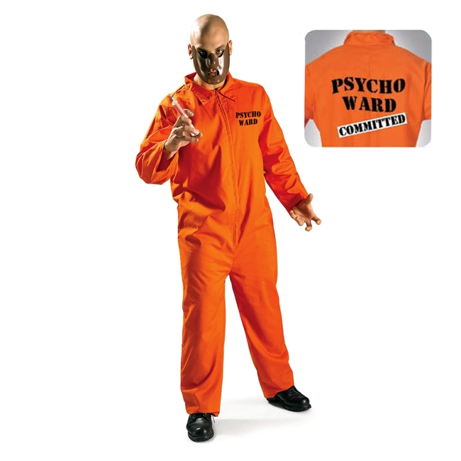 Get that psychotic look this Halloween with our scary Psycho Ward Adult Costume. No one on your cell block will dare to mess with a serial killer mental patient such as yourself. Our adult Psycho Ward Costume includes a bright orange zipper-front jumpsuit with ‘PSYCHO WARD’ printed on chest and ‘PSYCHO WARD COMMITTED’ printed largely across the back and the shaped brown face mask. The injection molded plastic half mask features a couple of bars over the mouthpiece for a spooky look. With a look so eerie, you would send chills down Hannibal Lecter the cannibal in this scary Halloween costume.