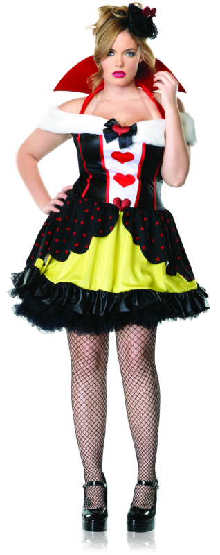 A master of seduction with a hint of corruption. The Queen of Hearts costume includes a high-collared royally ravishing dress that features heart appliqué on the bodice and plush trim at the neckline. A lace trim heart crown is also included in this wonderfully wicked costume.