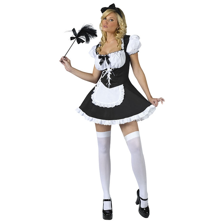 This sexy french maid is down for getting dirty! This Sexy Maid to Order Adult Costume includes a black and white fitted bodice dress with a lace-up waist, an apron, puff sleeves, and a circular skirt. A black hairbow headband is also included to complete this sexy career costume. Feather duster, thigh high stockings, and shoes are not included.