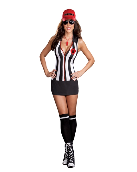 Get ready to blow your whistle!! There will be lots of penalties to hand out when you show up in this sexy Sheila B. Cheatin’ Referee Costume. Both unique and eyecatching, you are sure to score big in the black mini and white and black striped vest. Just enough red under the vest peeks out to grab attention to your assets, and the package also comes with your very own red whistle, and red REFEREE baseball cap. A red heart with a black letter R adorns the left side of the chest, like a badge that lets every know just who is calling the shots! A pair of black knee socks with a white stripe completes the package, but don’t end the game there! We have adorable accessories to add that special touch to your outfit! Try our Aviator Sunglasses and our Dreamgirl Wig in Black! And don’t forget our amazing shoes! The Adult Size Sexy Black And White Sports Shoe is really going to tie it all together! Don’t miss the kickoff, get you Sheila B. Cheatin’ Referee Costume today! * Stretch dress, matching black stretch knit shorts,red whistle, referee hat and knee socks. * Referee shoes and sunglasses sold separately.