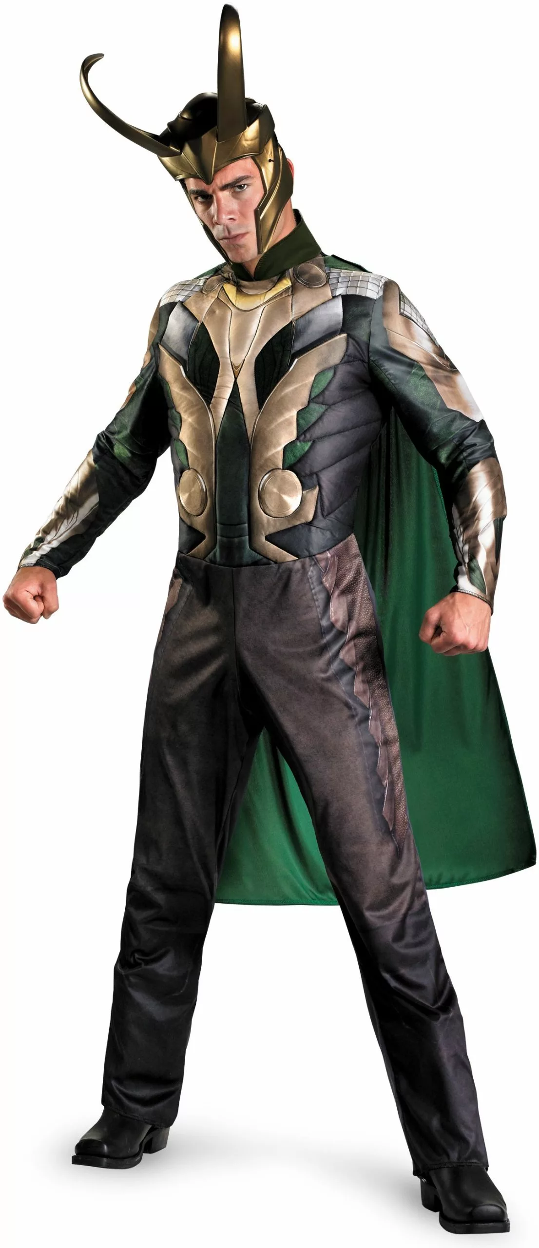 Transform into Thor’s best friend turned archenemy in the Thor Movie – Loki Deluxe Adult Costume which includes: A jumpsuit with padded faux armor, detachable jade cape and an intricately detailed gold helmet made to emulate the look seen in the 2011 feature film.