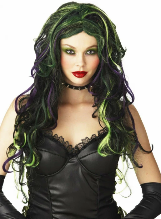 You must attest that this Wicked Witch of the West is fashionable at best and her spells exceed above all the rest. She’ll get you, my pretty, and then make you melt in water in this long, wavy black wig with purple, dark green and neon green highlights.
