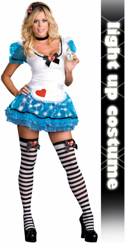 This fierce fairytale ensemble includes: A microfiber apron style dress with a back zipper, sequin heart appliqué/bow detail, contrast organza puff sleeves, and multi layered petticoat skirt featuring blue unique fiber optic lights with hidden pocket for on/off switch. Neckband, ruffled trim apron with functional heart shaped pocket, 2 sequin heart appliqué leg garters, matching headband and potion bottle with “Drink Me” label are also included in this whimsical wonderland ensemble.